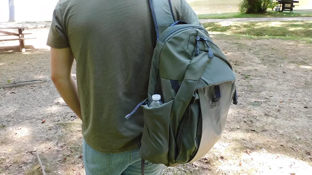 The front flap is more reminiscent of a backpack than a sling bag. It features two zippers and folds all the way down. A top flap protects the zippers for extra security if you want, or you can set them up to unzip from the side when rotating the bag to your front.