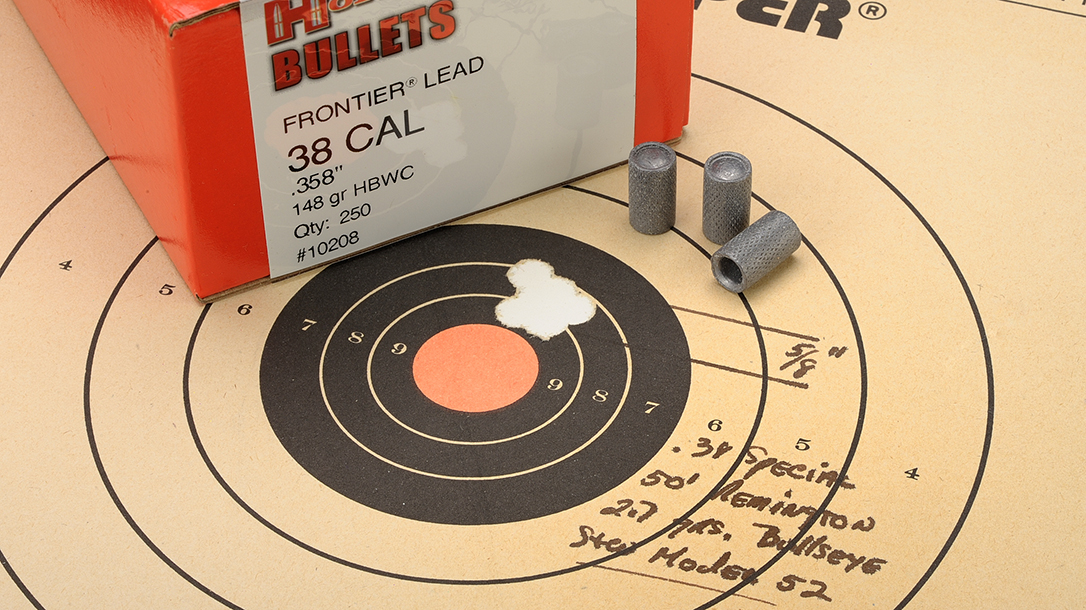 For use in my Model 52 and a few of my revolvers chambered for the .38 Special, the Hornady 148-grain hollow-base wadcutter (HBWC) is a good choice. I have used this bullet for years, and it never fails me for plinking or competition. Remington has cut back on many of its component bullets in recent years, and its lead 148-grain wadcutters were unfortunately discontinued. I liked those bullets; they seemed a bit harder than the competition, and leading was less of a problem. Finally, Speer is still in the fray with one offering, another HBWC.