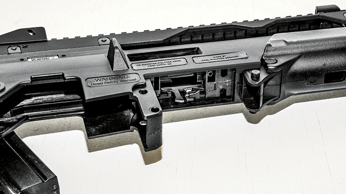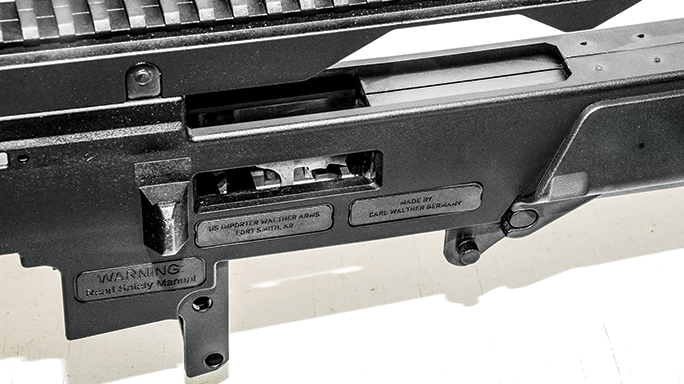 The rifle in my hands at the range is a little enigmatic. The box and receiver are both stamped with the famous Heckler & Koch logo, and the model “HK G36.” The box also says “.22 Tactical Rimfire,” and below that, “Made by Carl Walther, Germany.