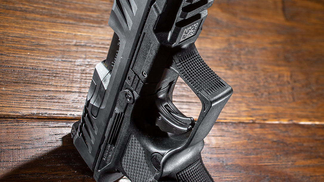 The frame is polymer and features a generous undercut behind the trigger. Because the grip is so narrow, the mag release, which is an ample round version, has little guards underneath them to prevent accidentally activating it.