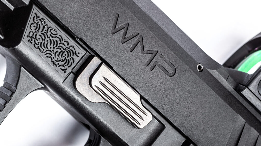 The gun uses both a button-style mag release as well as the triggerguard lever release. Both magazine releases are bilateral, and either method works equally well. Walther also equips the WMP with an ambidextrous slide lock in order to make the gun as southpaw-friendly as possible.