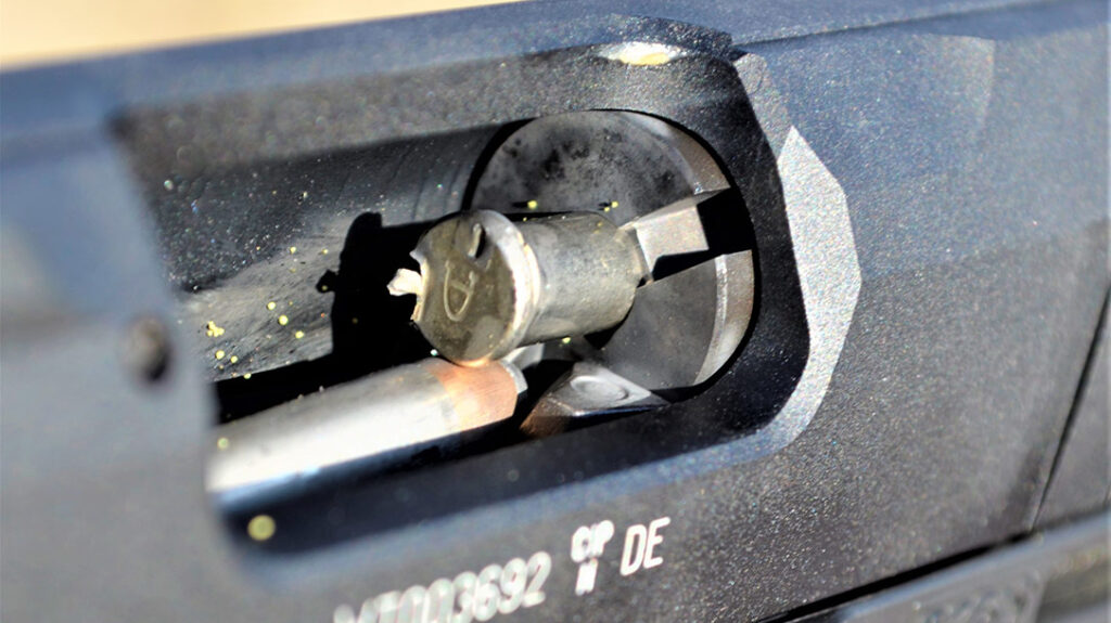 My face was peppered with unburnt powder, and when I looked at the WMP, its slide was partially locked open. Looking into the ejection port, I could see a casing partially extracted with a new round trying to feed underneath and tying up the slide. Once I removed the magazine and cleared the gun, I could see the round had ruptured at its rim.