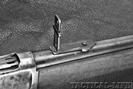 On ‘92 carbines, Winchester usually used this ladder-type rear sight. For fast work, it was left in the down position and the notch on the base was employed.