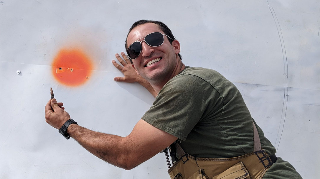 A spotter poses with the bullet in front of the bullseye.