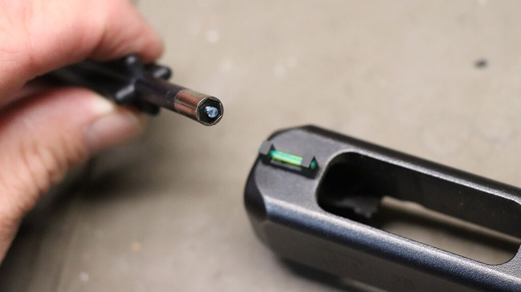 Next, I grabbed my Glock sight tool, unscrewed the old tritium sight, put a dab of blue Loctite (medium strength) on the threads of the new sight, and screwed it on. I made sure to pay careful attention to make sure the front sight was straight and not canted.