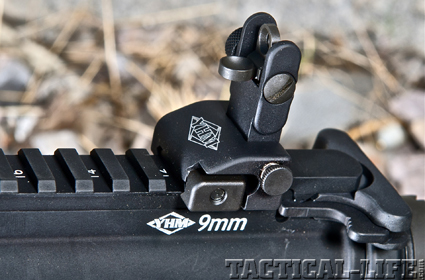 Yankee Hill’s QDS rear sight flips up easily with the press of a button and only extends 0.44 inches from the SBR’s top rail when folded.