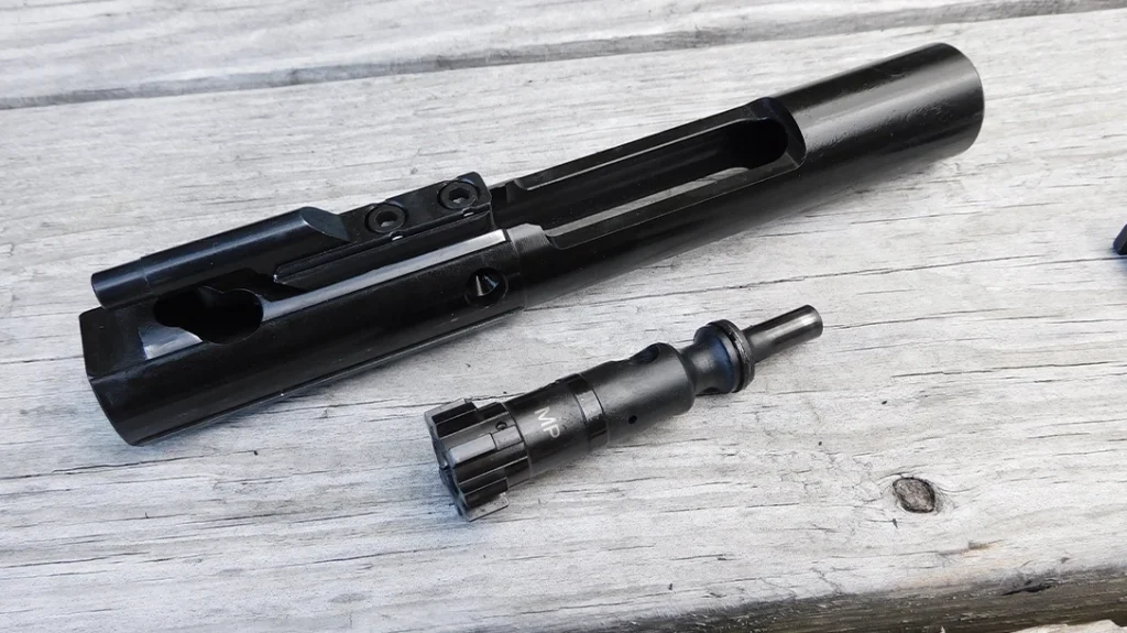 After two years, the expected wear on the bolt carrier looks minimal. The bolt also shows hardly any wear at all. I do ensure this rifle remains well-lubed because I use it so much, though I admit to not cleaning it as often as I should.