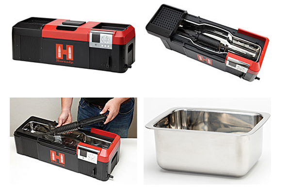 The Hornady Hot Tub features a 9 liter capacity, and it is long enough to accommodate and clean a 16 inch AR-15 upper. In addition to having 4 transducers, there is also a heating element that enhances cleaning action, which is especially useful when cleaning gun parts. Combined with One Shot Sonic Clean solution, the microjet action of the Hornady Hot Tub removes carbon residue and other debris from cartridge cases, gun parts and other metal equipment.